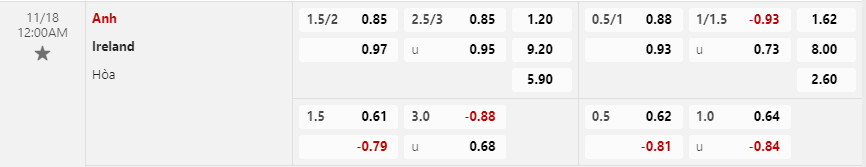Soi kèo châu Á Anh vs Ireland: 0.79*1.5*0.61