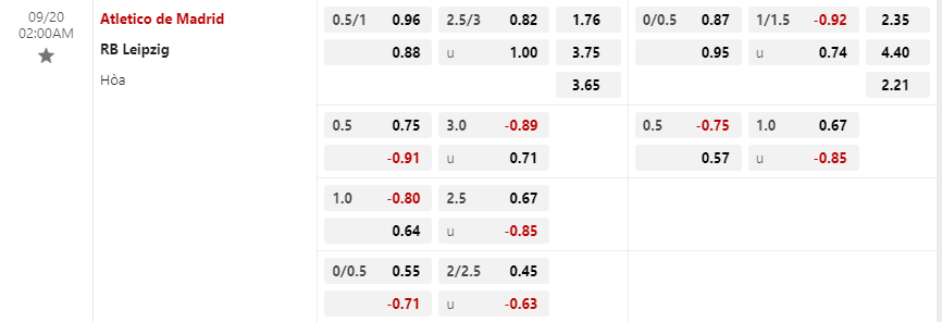 Tỷ lệ kèo Atletico Madrid vs RB Leipzig