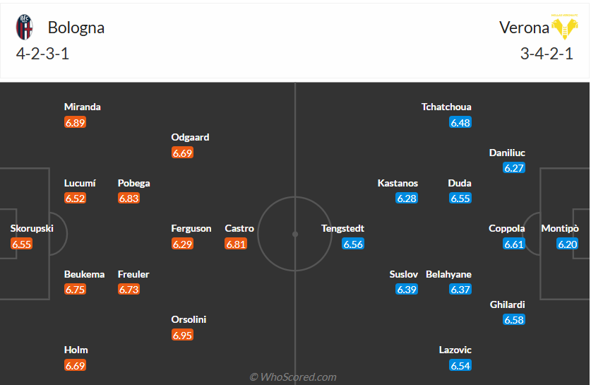Bologna đang đứng thứ 7 trên bảng xếp hạng, đây là vị trí kém hơn so với vị trí thứ 5 mùa giải trước nhưng trong bối cảnh họ mất nhiều trụ cột thì đây vẫn là vị trí rất ổn của thầy trò HLV Vincenzo Italiano. Phong độ của Bologna thời gian gần đây cũng là rất ổn nên họ hoàn toàn tự tin vào việc giành một kết quả tốt ở vòng đấu thứ 18 này, trước đối thủ yếu như Verona thì 3 điểm không phải điều khó thực hiện với đội bóng chủ nhà và nhiều khả năng họ sẽ đạt được mục đích.