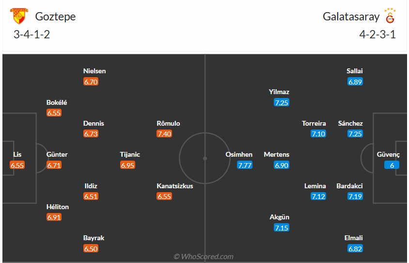 Galatasaray thắng cả 6 vòng đấu gần nhất và đã chắc chắn bảo vệ thành công chức vô địch của mình khi hơn đội đứng sau 8 điểm. Đây tiếp tục là một mùa bóng thành công của đội bóng này và họ muốn tiếp cục duy trì chuỗi trận ấn tượng đó ở 2 trận còn lại để khẳng định sức mạnh của mình. Đến làm khách trên sân của đội bóng mới lên hạng như Goztepe không phải trận đấu quá khó khăn với các cầu thủ Galatasaray và nhiều khả năng họ sẽ biết cách tận dụng cơ hội để ra về với 3 điểm trọn vẹn.
