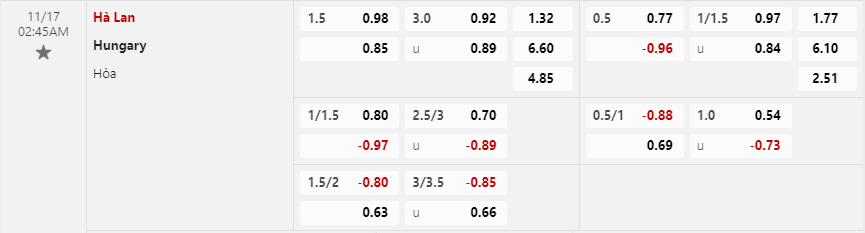 Soi kèo châu Á Hà Lan vs Hungary: 0.97*1.25*0.80