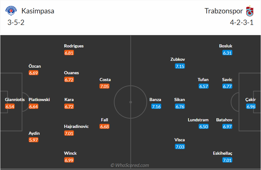 Trabzonspor là đội bóng mạnh của Thổ Nhĩ Kỳ, họ đứng thứ 3 mùa trước. Tuy nhiên mùa này đội bóng của HLV Fatih Tekke chơi chưa đạt yêu cầu, chuỗi 4 trận thắng gần nhất của mình chỉ giúp họ vượt lên trên Kasimpasa trên bảng xếp hạng để đứng thứ 7 với 3 điểm nhiều hơn đối thủ. Với phong độ đó các cầu thủ Trabzonspor rất tự tin khi đến làm khách trên sân Kasimpasa ở vòng đấu thứ 32 này và họ muốn có 3 điểm ra về. Đây không phải điều quá khó thưc hiện khi đội chủ nhà chơi không ổn định và nhiều khả năng đội khách sẽ đạt được mục đích.