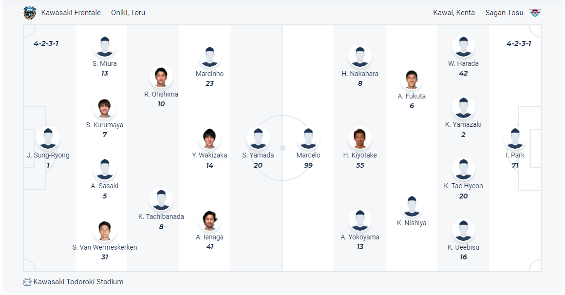Kawasaki Frontale đứng thứ 8 mùa giải trước, vị trí không đến nỗi tệ. Tuy nhiên mùa bóng này đội bóng của HLV Toru Oniki đang chơi rất tệ khi tạm thời có vị trí thứ 14 trên bảng xếp hạng, họ vừa để thua 2 trận liên tiếp nên rất cần chiến thắng ở vòng đấu thứ 30 này để không trôi xuống sâu hơn nữa trên bảng xếp hạng. Chỉ phài đón tiếp đội bóng cuối bảng Sagan Tosu là cơ hội tốt để Kawasaki Frontale tìm lại niềm vui chiến thắng và nhiều khả năng đội bóng chủ nhà sẽ có được điều mình cần.