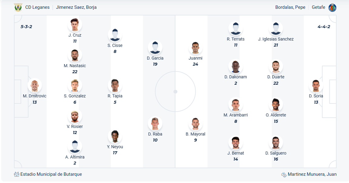 Getafe là đội bóng trung bình của La Liga, họ đứng thứ 12 mùa giải trước. Mùa này đội bóng của HLV José Bordalás đang đứng thứ 14, với số điểm hiện tại thì chưa đủ trụ hạng nên các cầu thủ Getafe vẫn cần chơi tốt trong các trận đấu sắp tới của mình. Sau khi để thua ở vòng đấu trước, Getafe cần một chiến thắng ở vòng đấu 26 này. Chỉ phải đến làm khách trên sân của đội bóng mới lên hạng Leganes là cơ hội tốt để Getafe giành chiến thắng và nhiều khả năng họ sẽ chơi tốt để có được điều mình cần.