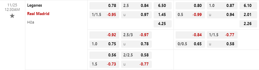 Soi kèo châu Á Leganes vs Real Madrid: 0.78*-1.25*0.95
