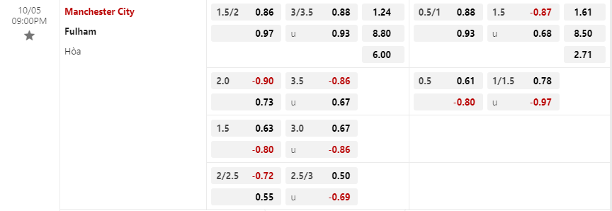 Tỷ lệ kèo Manchester City vs Fulham
