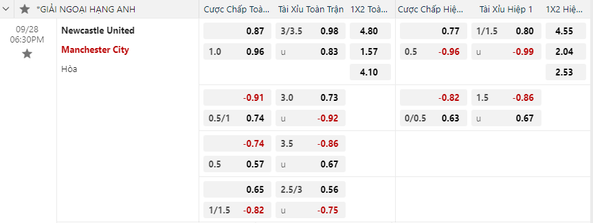 Soi kèo hiệp 1 Newcastle United vs Manchester City