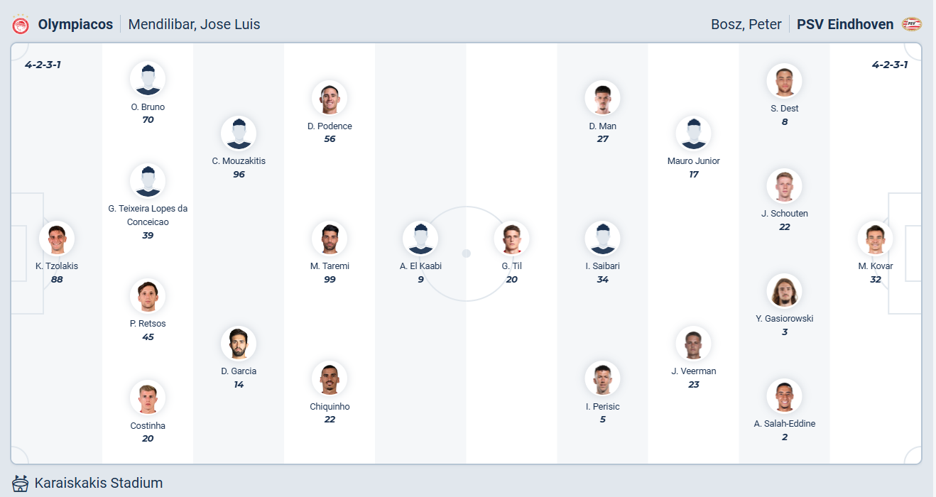 Lượt trận thứ tư vòng League Phase Champions League, Olympiakos sẽ tiếp PSV trên sân nhà với mục tiêu tìm kiếm chiến thắng đầu tiên. Tuy nhiên đây tiếp tục là trận đấu khó khăn khi mà PSV đang chơi tốt thời gian gần đây.