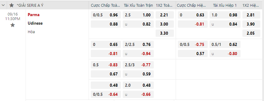 Soi kèo châu Á Parma vs Udinese