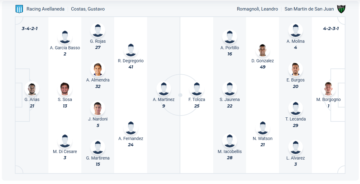Racing Club đang có phong độ cực cao tại giải vô địch Argentina, họ thắng cả 5 vòng gần nhất để leo lên vị trí thứ 6 trên bảng xếp hạng. Dù vậy đây vẫn là vị trí kém hơn những gì họ làm được mùa trước (thứ 3) nên các cầu thủ của HLV Gustavo Costas cần cần tiếp tục giành chiến thắng trong các trận đấu của mình. Ở đấu trường cup Quốc gia, họ đã vào đến vào 32 đội và muốn giành một danh hiệu vào cuối mùa, chính vì vậy các cầu thủ Racing Club cần vượt qua San Martin ở vòng đấu này. Trước đối thủ yếu hơn nhiều thì khả năng Racing Club sẽ đạt được mục đích.