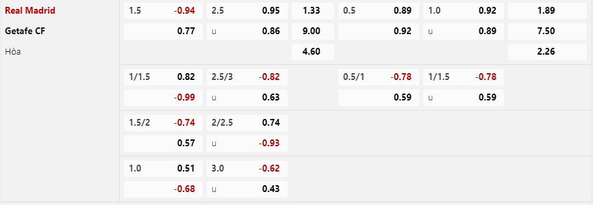 Tỷ lệ kèo Real Madrid vs Getafe