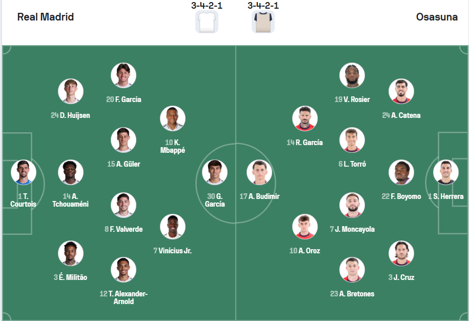 Real Madrid vừa trải qua một mùa giải thất bại, họ không giành được bất cứ danh hiệu nào. Kèm theo đó là sự thay đổi trên băng ghế chỉ đạo nên có rất nhiều dấu hỏi dành cho Real Madrid khi bắt đầu mùa giải này. Đội bóng của HLV Xabi Alonso cần chứng minh vị thế của mình nên muốn có khởi đầu mùa giải thật tốt, không cách nào khác ngoài viêc giành chiến thắng trước Osasuna ở trận đấu ra quân. Trước đối thủ yếu hơn nhiều thì đây không phải nhiệm vụ quá khó khăn, nhiều khả năng Real Madrid sẽ có chiến thắng với tỉ số cách biệt.