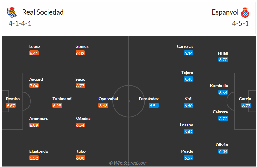 Sociedad là đội bóng được đánh giá vào hàng khá của La Liga, tuy nhiên họ thua 3 trận gần nhất tại La Liga và chỉ thắng 1/6 vòng gần nhất, chuỗi trận kém cỏi này khiến họ tụt xuống vị trí thứ 11. Đây rõ ràng là vị trí không hề tốt với đội bóng thường nằm trong top các đội dự cup Châu Âu, chính vì vậy các cầu thủ Sociedad cần ngay lập tức trở lại với mạch chiến thắng để cải thiện thứ hạng của mình. Chỉ phải tiếp đón một Espanyol yếu hơn là cơ hội tốt để Sociedad giành chiến thắng, nhiều khả năng đội bóng chủ nhà sẽ chơi tốt và có 3 điểm trận này.