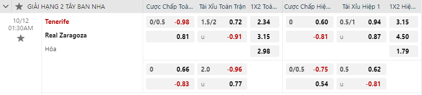 Tỷ lệ kèo Tenerife vs Real Zaragoza