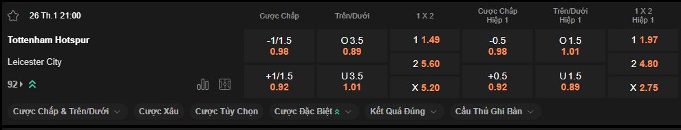 Soi kèo châu Á Tottenham vs Leicester: 0.96*1/1.5*0.84