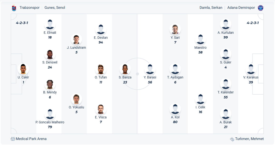 Trabzonspor là đội bóng mạnh của Thổ Nhĩ Kỳ, vị trí thứ 3 mùa giải trước của họ cho thấy điều đó. Tuy nhiên mùa này đội bóng của HLV Şenol Güneş đang thể hiện một phong độ vô cùng đáng thất vọng. Họ mới thắng 2 trận, sau chuỗi trận hòa liên tiếp thì Trabzonspor thua liền 3 trận và tụt xuống vị trí thứ 14 trên bẩng xếp hạng, họ bằng điểm với nhóm xuống hạng nên tình thế hiện tại là vô cùng bi đát. Trabzonspor cần ngay lập tức giành chiến thắng để cải thiện thứ hạng của mình và trận đấu với đội bóng cuôi bảng Adana Demirspor là cơ hội không thể tốt hơn để làm viêc này, nhiều khả năng Trabzonspor sẽ có được chiến thắng để chấm dứt chuỗi trận kém cỏi.
